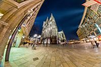 Fisheye foto van de Dom van Keulen met de omliggende winkels en de kathedraalplaat