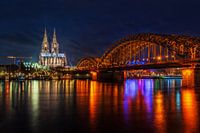 Wanneer de schemering neerdaalt over Keulen, transformeert het blauwe uur de stad in een betoverend schouwspel. In deze foto vormt de Hohenzollernbrücke, met zijn robuuste bogen en liefdessloten, een krachtig voorgrondcontrast met de imposante Dom van Keulen, die trots op de achtergrond troont. De hemel, getint in diepblauw met een vleugje paars, omhult de stad in een kalme gloed, terwijl de Rijn de laatste sporen van daglicht weerspiegelt. De verlichting van de brug en de subtiele gloed rond de Dom voegen een warme ondertoon toe aan de koele sfeer, waardoor een harmonieus evenwicht ontstaat tussen natuur en menselijke creatie. Dit beeld legt de essentie van Keulen vast: een stad waar geschiedenis en moderniteit samenvloeien, prachtig uitgelicht in het vluchtige moment van het blauwe uur. De Dom, met zijn gotische grandeur, en de brug, een symbool van verbinding, vertellen samen een verhaal dat zowel tijdloos als eigentijds is