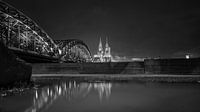 Kijkend naar de Dom, het centraal station en de Hohenzollernbrücke over de rivier de Rijn in zwart en wit.