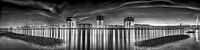Kraangebouwen, bruggen en kathedraal op een extra brede panoramafoto in zwart-wit 90410041ays