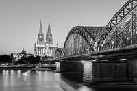 De Keulse klassieker in zwart-wit: de Hohenzollern-brug en de Dom van Keulen met de lichten aan en een prachtige, heldere hemel op een zwoele zomeravond.