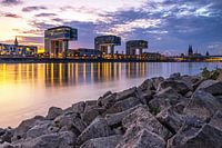 De moderne "kraanhuizen" in de haven van Rheinauhafen kantoren en appartementen.