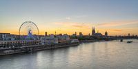 Panoramisch uitzicht vanaf de Severinsbrücke-brug in de richting van de haven van Rheinauhafen met het reuzenrad naast het chocolademuseum en de oude stad met de Dom van Keulen op de achtergrond.