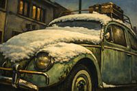 Dit sfeervolle schilderij vangt de poëzie van een winterse stadsavond. Een vintage Volkswagen Kever, bedekt met een zachte laag sneeuw, staat geparkeerd in een stille straat tussen karaktervolle gevels. Het warme licht uit de ramen contrasteert subtiel met de koele wintertinten en creëert een gevoel van rust, nostalgie en…