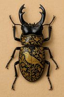 Deze digitale creatie toont een indrukwekkende zwarte kever met een rijk versierd schild, waarop een gouden vogel tussen sierlijke bladeren is afgebeeld. Het contrast tussen het glanzende pantser en de delicate patronen geeft het insect een bijna koninklijke uitstraling – als een levend sieraad.