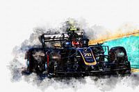 Illustratie van een serie legendarische Formule 1-racers en hun coureurs. Ontworpen uit liefde voor het klassieke racen. Geschilderd met aquarellen op papier.