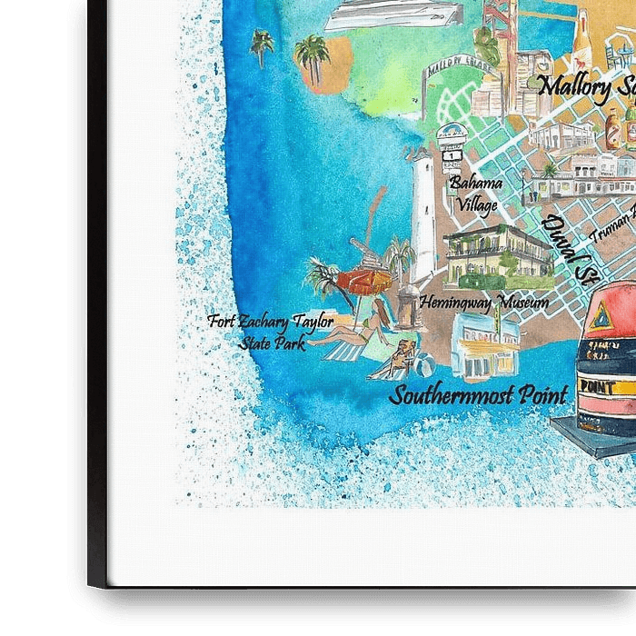 Koop dit schilderij Key West Florida geïllustreerde reiskaart met straten en hoogtepunten van Markus Bleichner als reproductie op canvas, aluminium dibond, (ingelijste) fotoprint, behang en ArtFrame, op maat geprint in Fine-Art kwaliteit.