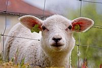 Nieuwsgierig lammetje kijkt door de draad van een hoger gelegen weiland in de buurt van de Watermolen van Wijlre.