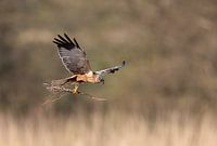 De kiekendief is een prachtige grote roofvogel, die zijn nest graag in het hoge riet langs de waterkant maakt. Hij vliegt af en aan met nestmateriaal. Droog gras, lange rietstengels en kleinere takken zijn allemaal geschikt voor het bouwen van zijn grote nest. Weken is hij er druk mee, heel vroeg in de ochtend, bij zonsopkomst is hij er heel druk mee. Elke ochtend stond ik al vroeg op de uitkijk met mijn camera en een mooie lens met een groot zoombereik zodat deze grote vogels niet verstoord werden tijdens deze voor hun belangrijke periode. Het vergt veel geduld om dit soort foto's te kunnen maken, ze vliegen dan wel regelmatig af en aan, maar er zitten langere periodes tussen de momenten van aanvliegen van een half uur tot wel een uur. Om dan plots weer verschijnen met het mooiste nestmateriaal in hun snavel of klauwen. Het moment dat de kiekendief komt aanvliegen is snel weer voorbij, dus geconcentreerd blijven is belangrijk, anders mis je zomaar het mooiste moment. De kiekendief op deze foto heeft verschillende kleinere takken gevonden voor zijn nest, en komt er in de opkomende zon mee aanvliegen. Hij steekt daardoor prachtig af tegen de achtergrond van riet en bomen! Een prachtig beeld voor aan de wand.