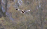 De kiekendief, een prachtige roofvogel, hier in de vlucht gevangen aan de bosrand. Hij lijkt bijna stil te hangen, in werkelijkheid zweeft hij snel voorbij, met zijn scherpe blik gericht op de grond, op zoek naar een smakelijke prooi, zoals een muis, mol of kikker. In het vroege, zachte ochtendlicht, steekt hij mooi af tegen de bomenrij. De zachte tinten geven deze foto een rustgevende sfeer, een heel mooi beeld voor aan de muur. Om een foto als deze te kunnen maken is veel geduld nodig, het moment is in binnen een paar seconden voorbij en het volgende moment laat vaak lang op zich wachten. Gefocust blijven is dus erg belangrijk om een foto zoals deze te kunnen maken. Soms zie je een half uur tot een uur niets en dan ineens is de kiekendief er, nooit op dezelfde plek, en altijd zo weer weggevlogen. Het is altijd een mooi moment als het mij gelukt is om de roofvogel zo mooi op de foto te zetten!