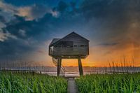 Uitzichtpunt de Kiekkaaste over het water de Dollard, Waddenzee, Groningen. Nederland, bij zonsondergang