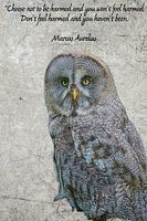 Grote grijze uil met tekst: 'Kies ervoor om niet gekwetst te worden en je zult geen pijn voelen. Voel geen pijn en je bent niet gekwetst'.