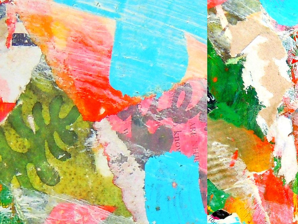 Dit kleurrijke speelse kunstwerk is een abstracte collage in gemengde technieken.