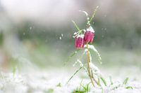 Kievitsbloem (Fritillaria meleagris) bedekt met sneeuw tijdens een sneeuwstorm in het stadspark van de oude Hanzestad Kampen.