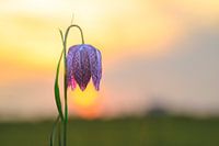 Kievitsbloem (Fritillaria meleagris) in een weiland tijdens een mooie lente zonsondergang in de delta van de rivier de Vecht in Overijssel, Nederland.