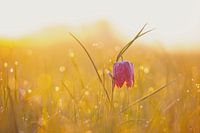 Kievitsbloem (Fritillaria meleagris) in een weiland tijdens een mooie voorjaarszonopgang met druppels dauw op het gras. Deze zeldzame wilde bloem groeit in de uiterwaarden van de IJssel in de Overijssel.