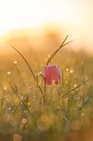 Kievitsbloem (Fritillaria meleagris) in een weiland tijdens een mooie voorjaars zonopkomstmet druppels dauw op het gras. Deze zeldzame wilde bloem groeit in de uiterwaarden van de IJssel in Overijssel.