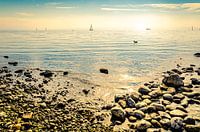 Kiezels aan de oever met zon in het tegenlicht in Immenstaad aan de Bodensee Duitsland