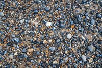 Kiezels en steentjes tussen het zand op het strand in Frankrijk. Afgeronde stenen door de stroming van de zee voornamelijk in het oranje, blauw, wit en grijs.
