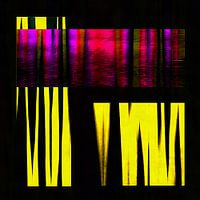 Een digitaal abstract met geometrische vormen en wat gekke strepen! Op een basis van zwart met een kleurrijk rood, oranje en paars paneel en enkele geelgestreepte panelen.