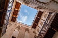 Omhoog kijken in de binnenplaats van Jibreen (Jabrin) Castle. De blauwe lucht lijkt ingelijst in een vierkantje. De muren zijn verfraaid met houten balkons en sierramen. Het traliewerk van de ramen is versierd met Arabische details. Dit fort ligt vlakbij Nizwa, in Oman, aan de voet van het Westelijke Hajar gebergte.