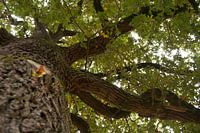 Kijk omhoog, de takken van een boom vormen een abstract spel tegen de groene bladeren en lucht.