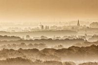 Kijk over bomen en huizen bij ochtendmist, Wijk bij Duurstede, Nederland