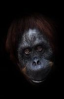 Kijk uit voor een goede grapjas. Slim intellectueel gezicht van een orang-oetan met een ironische blik en een halve glimlach, Geïsoleerde zwarte achtergrond.