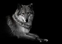 Kijkend naar het uiterlijk. Het vrouwtje van de wolf ligt prachtig op de grond, imposante leugens. Krachtig sierlijk dier Zwarte achtergrond verkleurd maar gele ogen