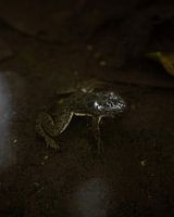 In deze mysterieuze natuurfoto zie je een kikker die stil onder het wateroppervlak ligt, gevangen in een moment van complete rust. De donkere aarde, zachte reflecties en subtiele lichtval zorgen voor een kalme, bijna meditatieve sfeer. De kikker lijkt je aan te kijken, als een wachter van het moeras – stil, geduldig en één met zijn…