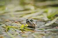 Foto van een kikker in het water. Door de focus op de kikker te leggen heeft de foto een zachte achtergrond gekregen en wordt de aandacht meteen naar de kikker getrokken.