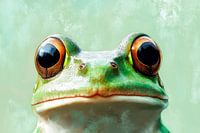 Het felgroene wezen zit daar met een betoverende blik die eindeloze verhalen vertelt. Glimmende, amberkleurige ogen knipperen nieuwsgierig naar buiten, terwijl de gladde, vochtige huid een vleugje exotische afkomst uitstraalt. In deze rustige houding geeft het de omgeving een magisch tintje en nodigt het je uit om de geheimen van de natuur te ontdekken.