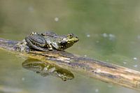 Kikker zittend op boomstam in water, Wilde dieren in Duitsland