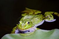 Een groene kikker zit in het bordje naast een lelieblad.