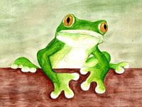 Deze aquarel toont een groene boomkikker. Als krachtdier staat de kikker voor genezing, zuivering, helderheid, transformatie en flexibiliteit. Een heerlijk ondersteunend krachtdier, vooral in bijzondere tijden.
