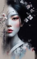 Portret van een Japanse vrouw, half verscholen achter bloesemtakken.