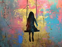 Kind Schommel | Schommel Kind - In dit abstract schilderij zie je een kind dat op een schommel zit, omringd door kleurrijke achtergrond met roze, goud en blauw, wat het een speelse en dromerige uitstraling geeft.