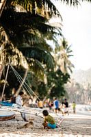 Kind en hond op het strand in Filipijnen. Vissersdorpje; Port barton.
