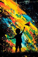 Een krachtig en kleurrijk kunstwerk waarin de silhouet van een kind met een papieren vliegtuigje centraal staat. Het ontwerp combineert abstracte kleuren met een gevoel van beweging en energie, wat het perfect maakt voor een eigentijds interieur. De speelse kleuren en dynamische compositie brengen leven in elke ruimte, terwijl de silhouet een gevoel van onschuld en fantasie oproept. Dit werk past perfect in een moderne setting, zoals een slaapkamer of hobbykamer, en kan ook inspiratie bieden voor creatieve ruimtes.