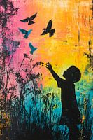 Een kleurrijk kunstwerk dat een silhouet toont van een kind dat reikend naar vogels kijkt, met een dynamische achtergrond vol levendige tinten geel, oranje, blauw en roze. Het ontwerp straalt vrijheid en speelsheid uit en past perfect in moderne interieurs, zoals een woonkamer of hal. Deze unieke creatie brengt een energieke en inspirerende sfeer in elke ruimte en is een echte blikvanger.