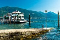 Terwijl het water van het meer over zijn voetjes spoelt, staat het kind eenzaam aan het eind van de pier te kijken naar de veerboot.
