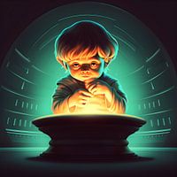 "Child of the Luminous Future" toont een jong kind dat baadt in een etherische gloed die uitgaat van een cirkelvormige lichtbron. De compositie bevindt zich in een elegante, futuristische ruimte die wordt gekenmerkt door zachte rondingen en vloeiende architectuur en straalt een gevoel uit van onschuld en innovatie. De zachte verlichting en minimalistische achtergrond creëren een kalme maar mysterieuze sfeer - perfect voor verzamelaars die visionaire, op sciencefiction geïnspireerde kunst met emotionele diepte waarderen.