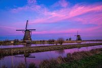 Een landschapsfoto van de Kinderdijk in de richting van de Overwaard tijdens de minuten na zonsondergang op een zonnige winterdag. Op dit moment waren de wolken prachtig paars gekleurd.