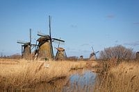 Molens aan de Kinderdijk die eeuwenlang gebruikt zijn voor het op peil houden van het waterpeil in de Zuid-Hollandse polders.