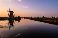 Windmolens aan de Kinderdijk gefotografeerd bij de ondergaande zon met avondkleuren in de lucht.