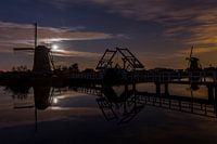 Kinderdijk in de nacht met volle maan, wolken, enkele molens en een ophaalbrug in Nederland.