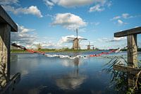 Aan het water zijn er verschillende windmolens in Kinderdijk in Nederland