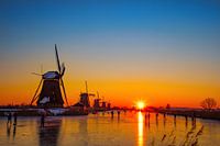 Koop de foto Kinderdijk in winter met schaatsers en zonsopkomst van Gert Hilbink op canvas, aluminium dibond, (ingelijste) fotoprint, behang en ArtFrame, op maat geprint in Fine-Art kwaliteit.