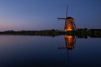 Reflectie van een verlichte molen in Kinderdijk tijdens lichtjesweek, begin september.