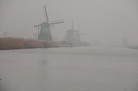 een mistige ochtend aan de kinderdijk laten de molens in de mist mooi uitkomen tegen de achtergrond.